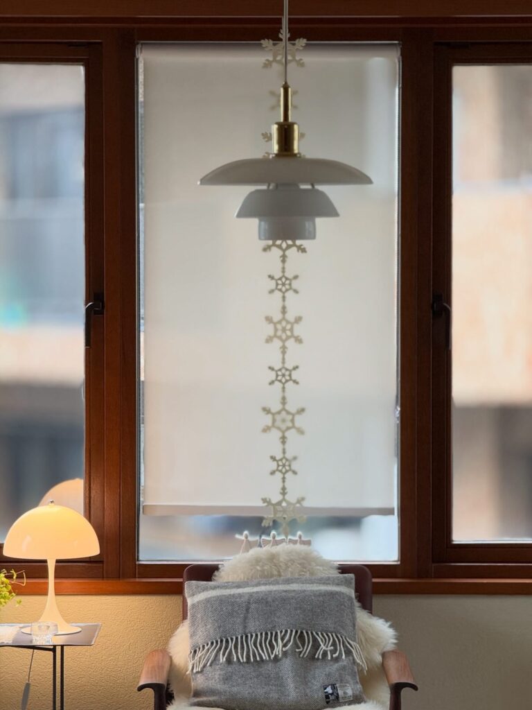 木の温もりを感じる内装と、ルイスポールセンの照明をはじめこだわりのインテリアに囲まれた素敵なお部屋にTUISS DÉCORのロールスクリーンをお使いいただいています。