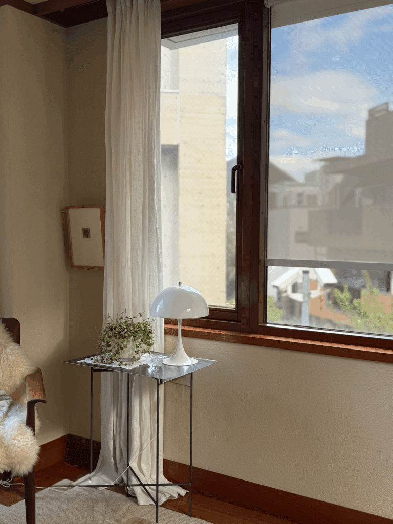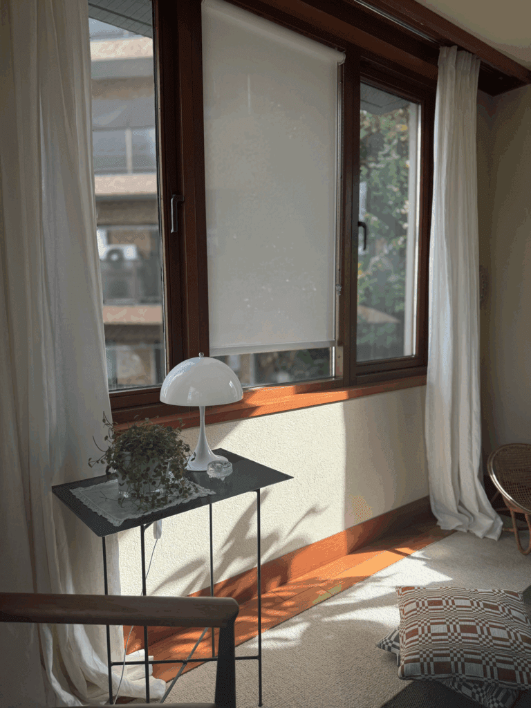 今回迎えたブラインドは、光を細やかに調整できるところが魅力。時間帯や天気によって光の表情が変わり、部屋に奥行きが生まれました。リネンのカーテンとも相性がよく、外からの視線をやさしく遮りながらも閉塞感がありません。設置も一人で簡単にでき、部屋に入るたびにお気に入りの照明が映えるのを見ると、選んでよかったと感じています。